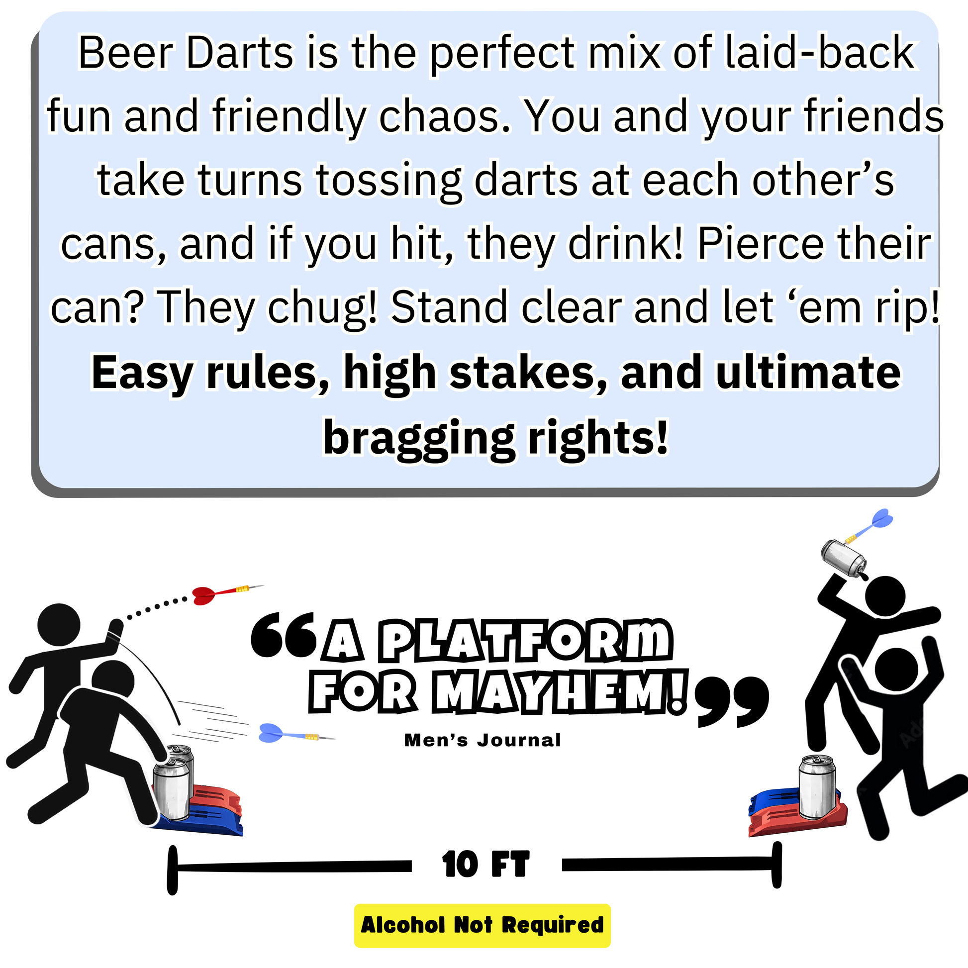 Take everything you love about throwing darts and give it a party twist. The new and improved Beer Darts set is built for parties, tailgates, and game nights- indoors or out! With the built-in backboard clip, missed throws are safely caught so the game stays fast and fun. Lightweight, portable, and quick to set up, Beer Darts is always ready when the party starts.